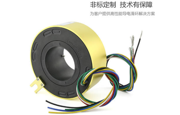 過孔滑環(huán)又稱為空心軸滑環(huán),屬于導電型滑環(huán)的一種類型,是為了滿足中間必須有孔的要求而研制發(fā)明的。它主要是從結(jié)構(gòu)上區(qū)分的,與其它類型的滑環(huán)的區(qū)別在于空心軸導電環(huán)中間有一通孔。但是,過孔滑環(huán)的制造和原理又與其它種類的滑環(huán)類似,都是通過電刷線和接觸點接觸,將設(shè)備電流、電壓、信號等數(shù)據(jù)從固定位置傳輸?shù)叫D(zhuǎn)位置。